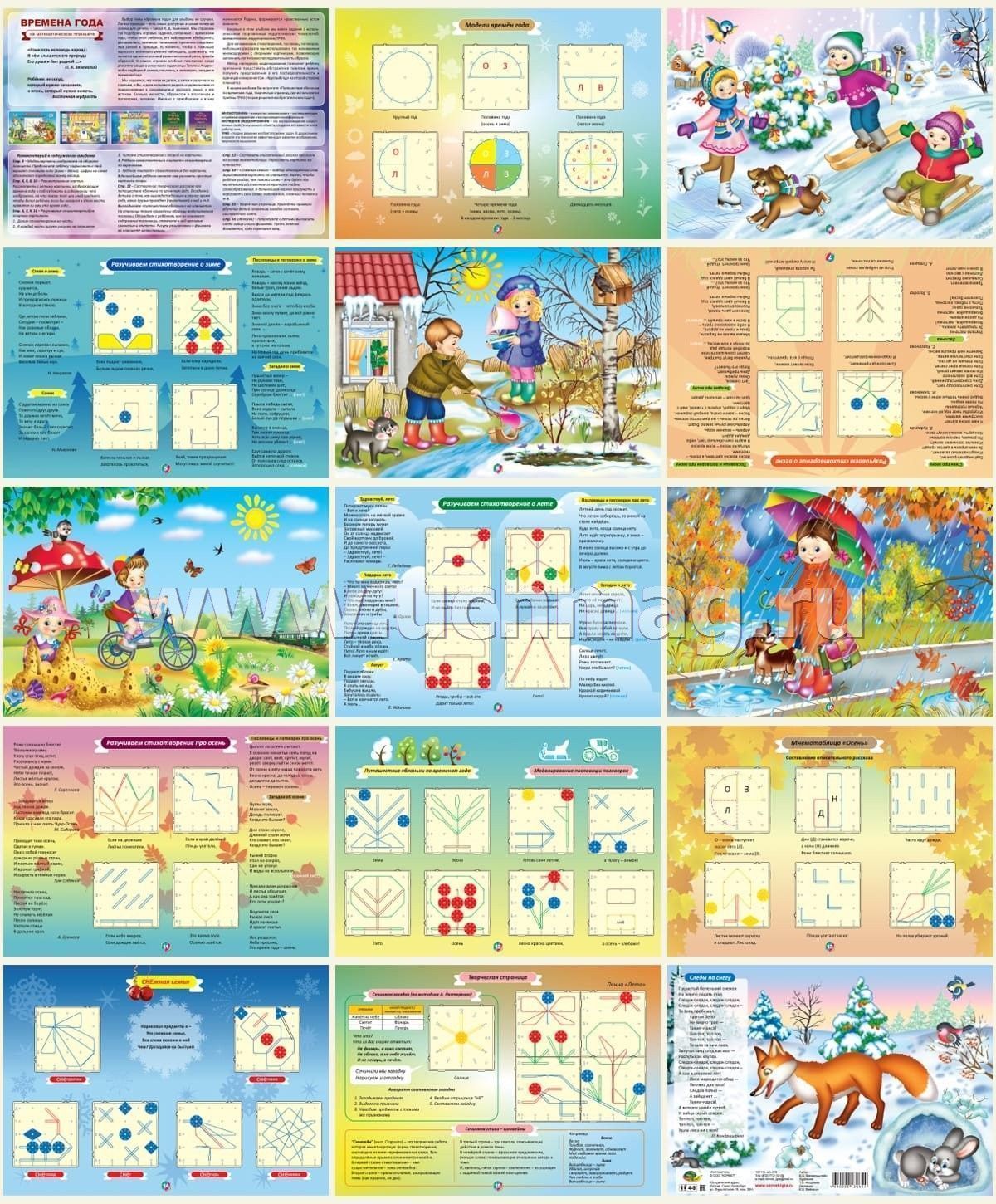 Развивающая игра "Времена года на математическом планшете" продолжает серию игр к Математическому планшету. Игровые задания, связанные с временами года, подобраны так, чтобы опыт ребёнка, его наблюдения обобщались, расширялись, возникло понимание причинно-следственных связей в природе. И, конечно, чтобы с помощью взрослого возникало умение наблюдать, сравнивать, что является одним из условий развития связной речи, яркой и образной. В нашем игровом альбоме "Времена года на математическом планшете" позитивная среда для этого создана рисунками художницы Татьяны Андреевой и подборкой стихов, пословиц и поговорок, загадок о временах года. Впервые в этом альбоме мы ввели задания с использованием современных педагогических технологий: мнемотехники, моделирования, ТРИЗ. Для запоминания стихотворений, пословиц, поговорок, небольших рассказов мы использовали, так называемые мнемодорожки с опорными картинками, позволяющие запомнить логическую последовательность образов. Метод наглядного моделирования позволяет ребёнку зрительно представить абстрактное понятие время, получить представление о его последовательности и единицах измерения (См. "Круглый год" на второй стороне планшета). В нашем альбоме вы встретите "Путешествие яблоньки по временам года, творческую страницу, где используются приёмы ТРИЗ (теории решения изобретательских задач).