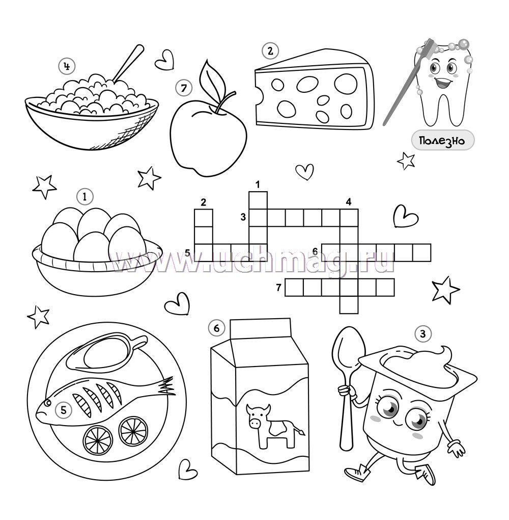 Познакомьте ребенка с основными правилами: начинать решать кроссворд можно с любого зашифрованного слова; каждая клетка предназначена только для одной буквы; слово начинается с клетки, где стоит номер, и заканчивается краем фигуры кроссворда; буквы в словах-отгадках вписываются сверху вниз и слева направо. На этапе обучения буквы может записывать взрослый. Дети, знающие алфавит, заполняют клетки самостоятельно. Раскрасьте отгадки.