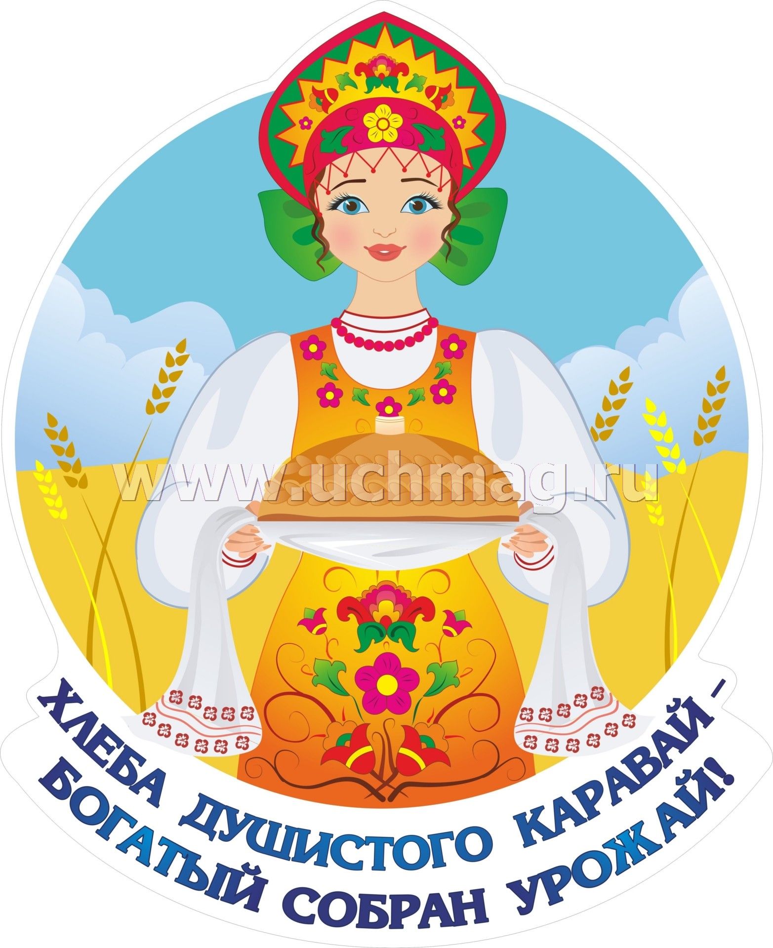 Девушка с караваем - русская красавица, труженица, хлебосольница - этот красочный плакат-вырубка пригодится для украшения актового зала к утреннику, стилевого тематического празднику осени, праздничного оформления группы в осенний период, для проведения бесед о значении хлеба в жизни общества.